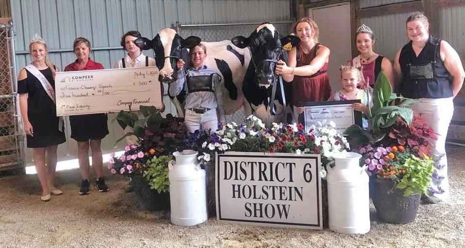 The District 6 Holstein Breeders held their 20th annual Holstein Futurity in conjunction with their breed show on July 1 at the Rock County Fairgrounds in Janesville. To qualify, Holstein breeders entered calves three years ago in hopes that their entry would return to compete for a percentage of the cash winnings and one of two additional sponsored prizes for placing first or second in the class. Pictured from left are Wisconsin Holstein Princess Ava Booth, Tami Behnke representing Compeer Financial who is presenting a $500 check to Gracin and Chesney Speich of Orfordville. Chesney is holding their winning entry, Hobby-Hill Angler Giddy-Up. Rumspringa Rdg Low Altitude, the second place entry, is being presented by Brooke Mueller of Albany. Presenting the second place $250 prize on behalf of Go-Sho Cattle Company and Cattle Traxx of Whitewater are Sadie Kropf, Wisconsin Holstein Princess Attendant Aubrey Behling, and Stella Schmocker.