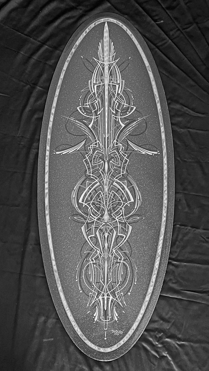 Hagstrom was asked to be part of a traveling art show that focused on pinstriping as a fine art and is being featured at museums across the country. His piece is currently in Salina, Kansas, at the Garage Auto Museum. It’s named “Flyin’ Paint”. He describes it as a 36-inch high by 17-inch wide steel oval with a rolled edge painted metalflake with candy orange and dark oranges. The variegated gold leaf is hand gilded and “engine turned” with three clear coats and eight colors of pinstriping done in Hagstrom’s “Donut Boy” style scroll work.