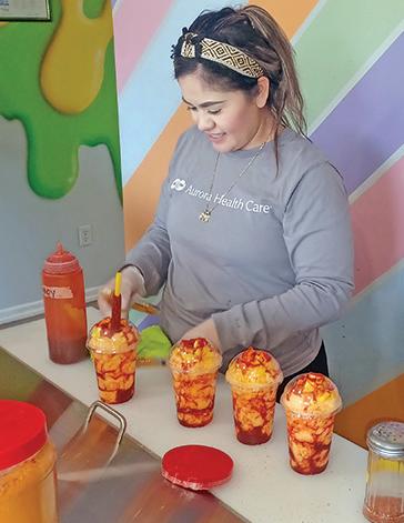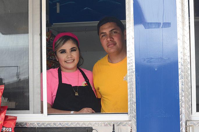 above: Miriam and Jonathan Moreno, owners of the Gathering Spot and Snacks, work inside their food truck at Experience Burlington Days this summer. at left: Miriam Moreno fulfills an order of Mangonadas at the Gathering Spot and Snacks,