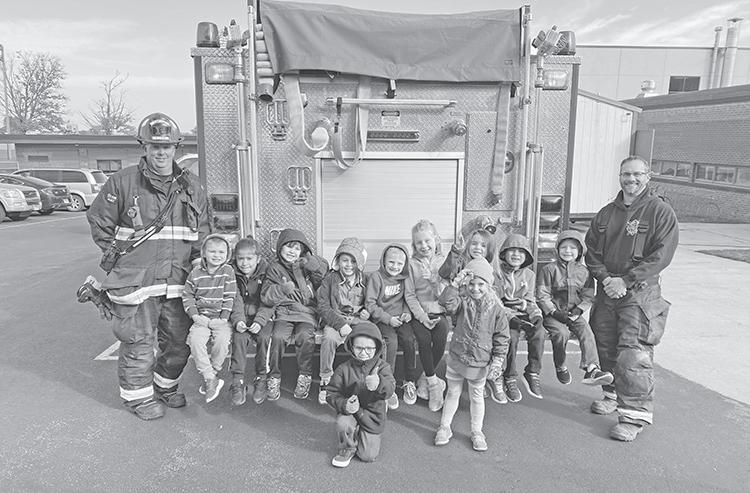 (Left) Mr. Allen’s Kinder garten class posing with Firemen Nathan Pickard and Travis Voss during the Firehouse day.