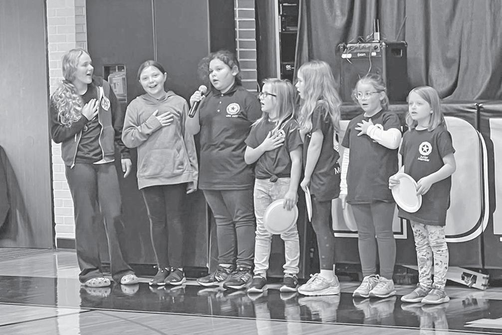 Junior members of the Lena American Legion Auxiliary led the Pledge of Alle giance at the recent Veterans’ Day program at the Lena-Winslow High School. Pic tured left to right are Keighlyn Schulz, Jocelyn Youtzy, Brishti Schoonhoven-Hussain, Janessa Avila, Kinzley Schulz, Liesl Jones and Kairi Schulz.