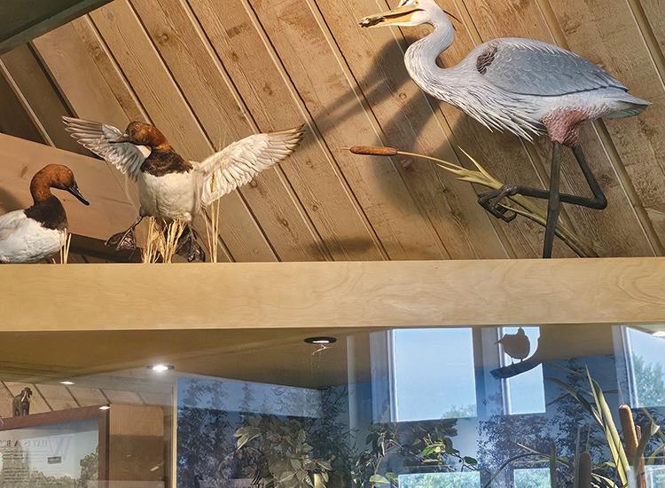 top right: After completing the walk to the eye of the bog, this group enjoys the view before returning to the visitor center. at right: Many waterfowl and birds make their home at Volo Bog and are memorialized in displays in the visitor center.