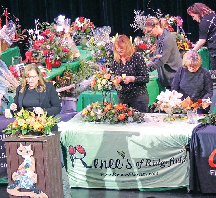 above: The stage is full of fresh flowers that the floral designers draw from to create their unique designs during McHenry Garden Club flower shows. top: Designers from Countryside Florists create arrangements to be given to a lucky audience member.
