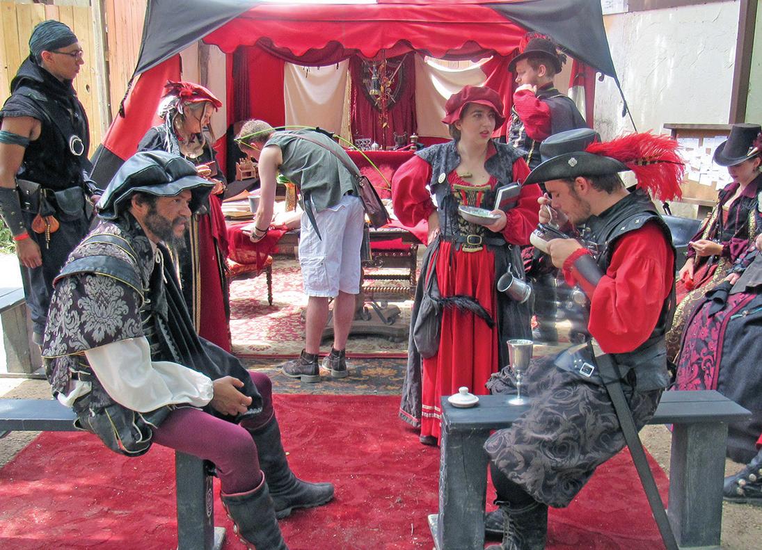 above: Visitors are welcomed to the Renaissance Faire. Once through the main entrance to the fictional city of Bristol, they are immersed into the culture of that time. at right: Members of the cast gather to have lunch together.