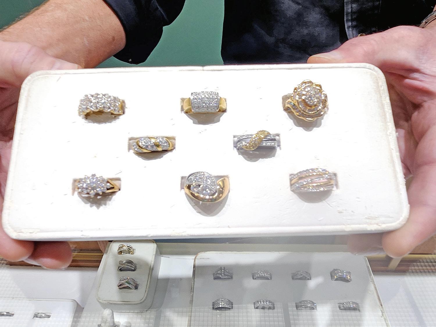 top: A variety of chains and earrings, many of them in sterling silver is a great way to purchase attractive jewelry at a reasonable price. above: Stacking a variety of bracelets is a great way to display them. The top bracelet is one of the new style bracelets without a clasp. Once attached to the arm it remains on until you return to jeweler and have it removed. top right: Not all diamond rings are engagement rings. Some are known as right-hand rings as they are meant to be worn on the right hand. at right: Citizen watches are very popular. These watches do not require a battery but continue to recharge from light. Men and women styles are available.