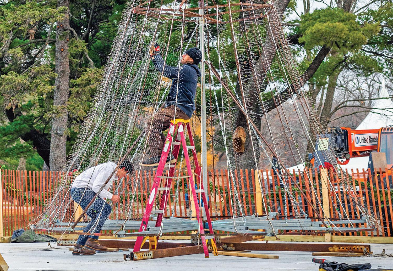 The tree begins with a supporting steel frame that consists of three separate 10foot poles in the center and a stand that raises it another foot. The star was added in 2021 and was 4-feet in diameter. Today, it’s 5-feet, meaning this year’s tree will be a grand total of 36 feet tall.