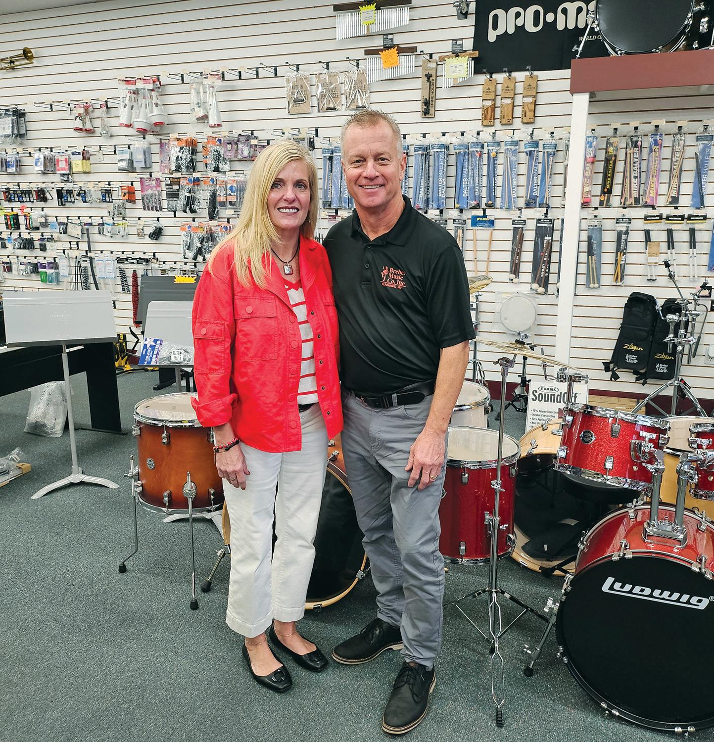 top: Bart and Amy Breber are the current generation of the family to run Breber Music, which is at 801 E. Geneva, Elkhorn. at right: Drums require a bit more space in the home than most instruments, as this display in the store shows.