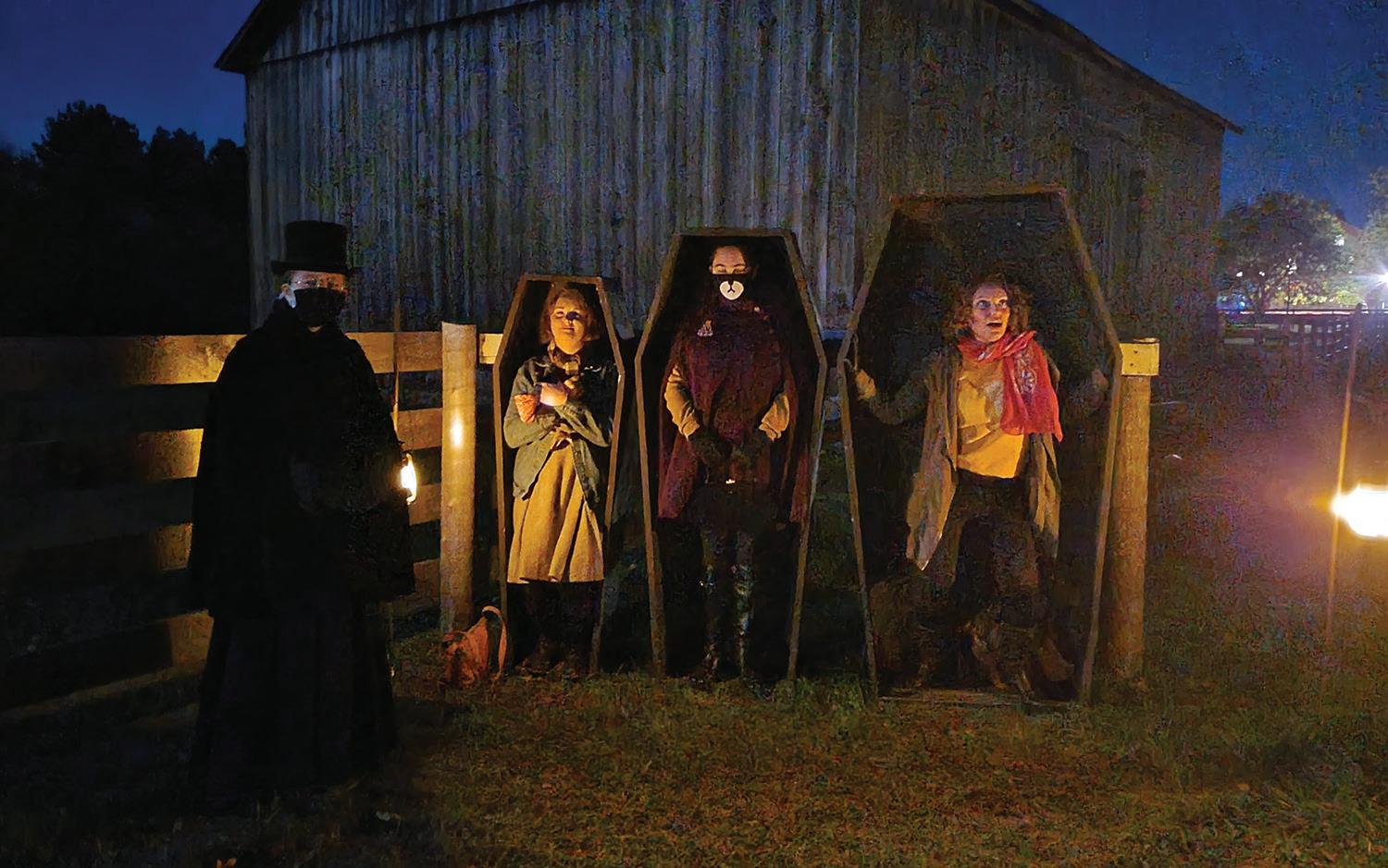 top: A family enjoys the Halloween decorations and displays at Old World Wisconsin. middle: These youngsters take in the Halloween décor, including this stack of pumpkins. at right: Costumed performers at the history museum stand inside coffins as they tell their “legendary” stories to guests.