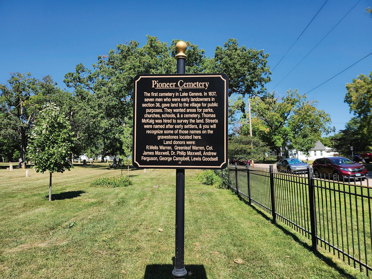 Outside the cemetery there is a plaque which reads: “Pioneer Cemetery The first cemetery in Lake Geneva.