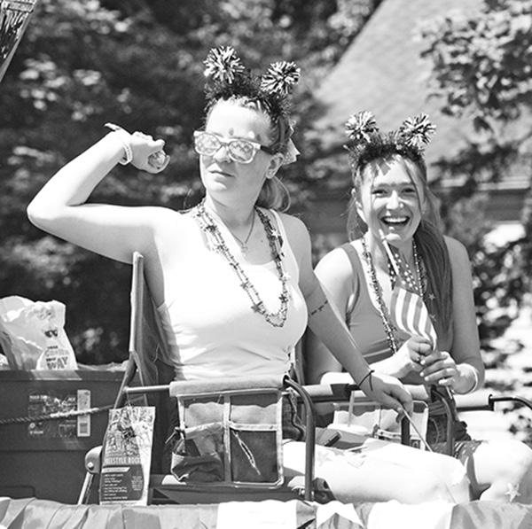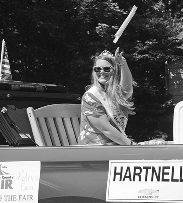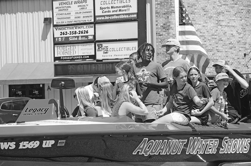 The Twin Lakes Area Chamber and Business Association presented the annual Libertyfest parade and related activities on July 6, including a water ski show. clockwise from above: Maddie Orth and Hailey Harpster shower attendees with candy while aboard the Harpster Lawn Maintenance float; Kenosha County Fairest of the Fair Katrina Cain tosses a popsicle to spectators; members of the Aquanut Water Shows have fun riding in a boat in the parade; a fleet of local fire and rescue vehicles make their way along the route; Uncle Sam rides on a tractor pulling the Beca’s Beauty Bar float.