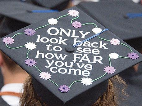 At the University of Wisconsin-Whitewater’s held spring commencement in May, a student shares some wisdom on their cap. Whitewater’s Catherine Yang receives her bachelor of science degree at the commencement.