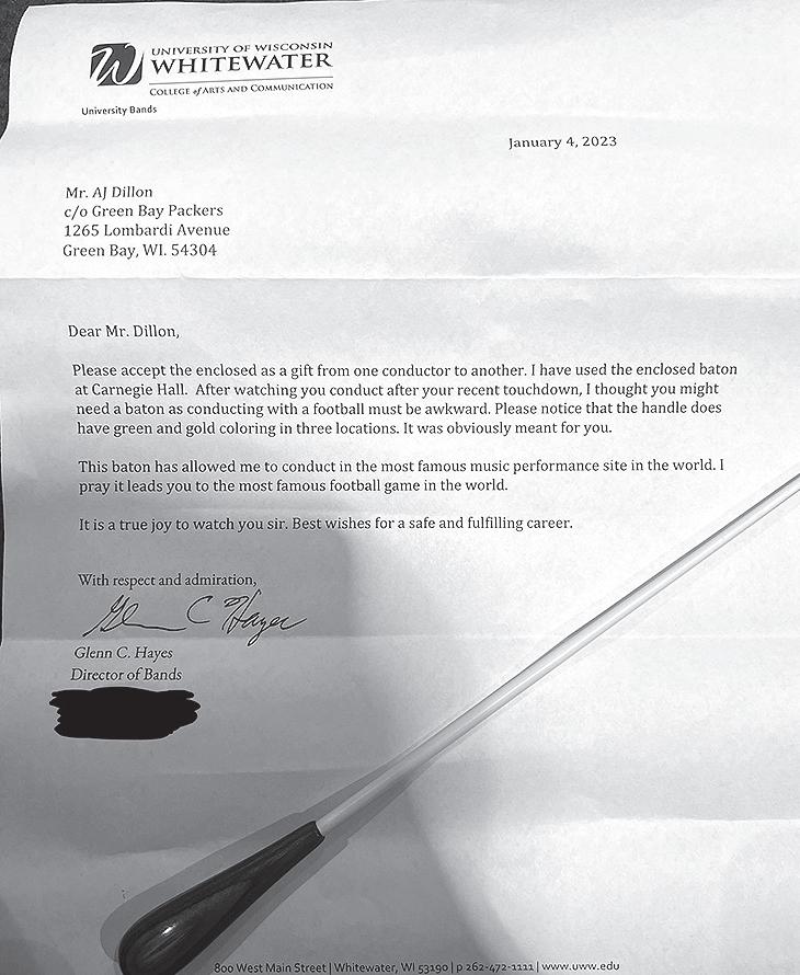 University of Wisconsin-Whitewater band director Glenn Hayes sent this letter and baton to Green Bay Packers’ running back AJ Dillon following the Packers’ win over the Minnesota Vikings earlier this year.