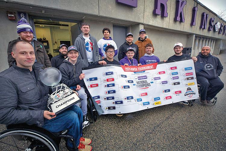 Head coach and Paralympian Jake Williams, left, holds the national champion trophy with most of the men’s wheelchair basketball team after the Parade of Champions, where UW-Whitewater and the Whitewater Fire Department honored national champion athletes in men’s wheelchair basketball, gymnastics and track-and-field on Apr. 3, 2024.