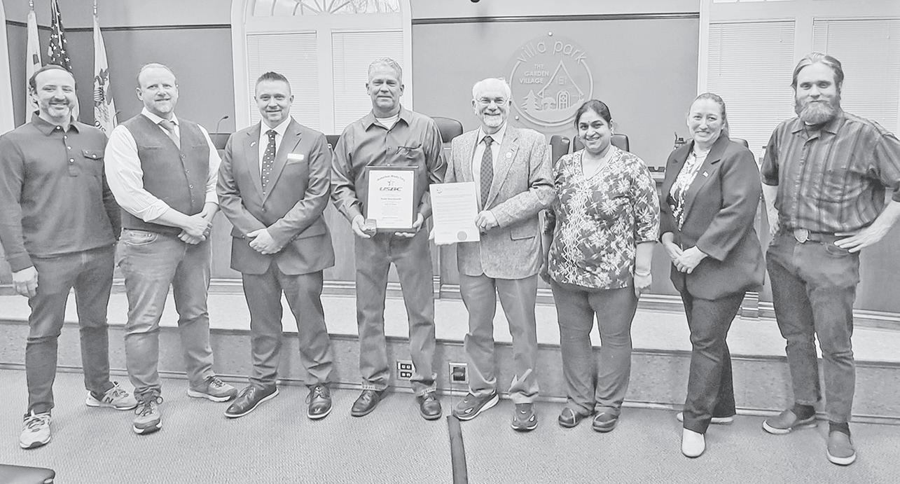 Villa Park native Todd Borchardt was inducted into the Suburban Windy City United States Bowling Congress (USBC) Hall of Fame in March. The Villa Park Village Board recognized Borchardt’s induction during last week’s board meeting. Borchardt joined a youth bowling league in 1979. He graduated from Willowbrook High School in 1984. Borchardt has fired 29 perfect games during his bowling career. In addition to those 29 game scores of 300, he has bowled seven 299 games and three 298 games. He was inducted into the Suburban Windy City USBC Hall of Fame for Superior Performance during the organization’s March 23 induction ceremony in Schaumburg. Borchardt is pictured with the members of the Villa Park