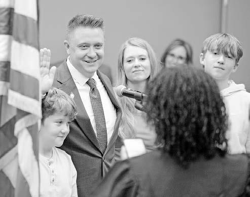 Kevin Patrick was sworn in as Villa Park’s new village president during the Villa Park Village Board meeting on May 12. Patrick is pictured (above) with his wife, April, and two of their three sons—Grant (left) and Benjamin (right)—while DuPage Circuit Court Judge Chantelle Porter administers the oath of office. The May 12 meeting also featured the swearing-in of a newcomer to the village board—Village Trustee Tina Konstatos. Two other village trustees—Jack Kozar and Deepasriya Kumar— were sworn in to begin their second terms on the board. Rolf Laukant was sworn in as Villa Park’s new village clerk during last week’s board meeting. Pictured (at left, left to right) after the meeting are: Village Trustee Jorge Cordova, Kozar, Patrick, Kumar, Village Trustee Cari Alfano, Konstatos and Laukant.