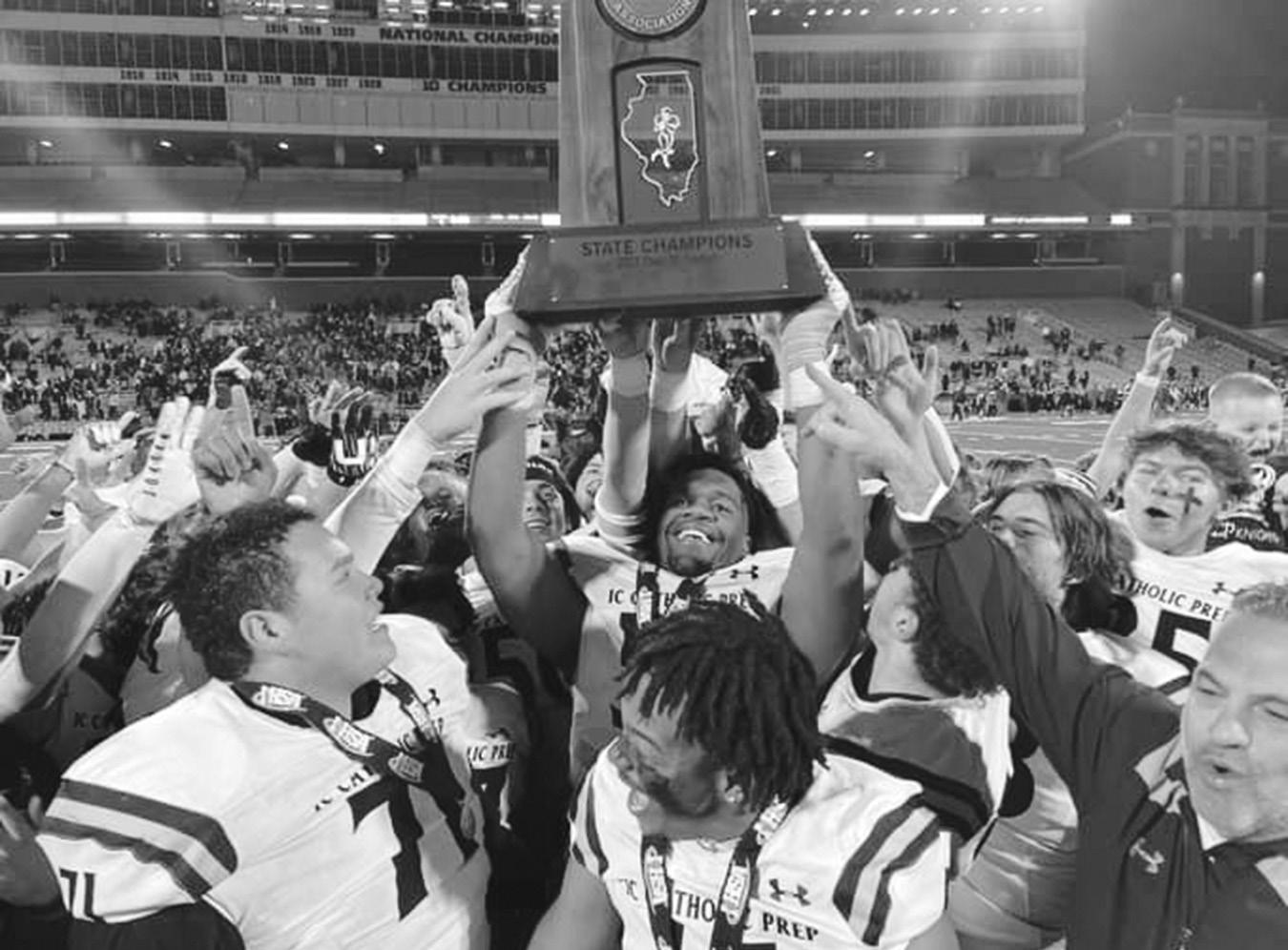 The Knights of Immaculate Conception Catholic Prep (ICCP) hoist the trophy over their heads after winning the Class 3A state-championship game at the University of Illinois in Champaign-Urbana, beating Willliamsville by a score of 4817. ICCP finished the season 13-1, winning its sixth football state championship since 2002 and its fourth under Coach Bill Krefft.
