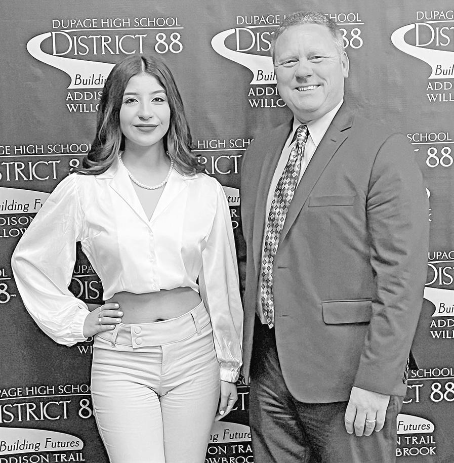 Willowbrook High School senior Leslie Avila Torres was named her school’s recipient of the 88’s Best award for the month of November. Avila Torres was recognized during the District 88 Board of Education’s Nov. 14 meeting. She is pictured (left) at the meeting with Willowbrook Principal Dan Krause. The 88’s Best honor recognizes students for their achievements in and out of the class room. Avila Torres received the 88’s Best award for exhibiting the continuous growth and improve ment that educators hope for in students. Her counselor at Willowbrook—Lourdes Piña—described Avila Torres as focused, responsible and engaged. “Her senior year has been a wonderful example of how far she has come,” stated Piña in her comments congratulating Avila Torres on receiving the 88’s Best award. “She embodies the tenacity and perseverance of a Warrior and has overcome her initial obstacles.” While English is her second language, Avila Torres has successfully completed courses with and without additional support. Avila Torres is a member of Willowbrook’s Students for H.O.P.E. (Helping Organ Procurement Education). She is enrolled in the cosmetology program at Technology Center of DuPage (TCD). Krause noted during the recent board meeting that Avila Torres is assisting West Chicago High School’s theater department by serving as the makeup artist for its upcoming productions. Avila Torres plans to pursue a degree in nursing. She’s also looking forward to opening her own salon with her sister and uncle.