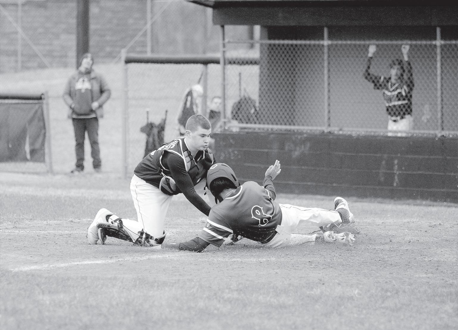 of the Willowbrook baseball team is pictured while tagging a Bartlett baserunner at home plate during last week’s game in Villa Park. The runner, who tried to score from third base on a fly out to left field in the top of the fifth inning, was called safe at home. Bartlett’s run on the play cut Willowbrook’s lead to 3-2. The Warriors scored two runs in the bottom of the fifth inning to take a 5-2 lead. Willowbrook defeated Bartlett 5-2 in the March 22 contest, which was shortened to five innings because of darkness and rain. The Warriors improved their record to 1-1 with the win. Willowbrook opened its season with a 9-6 loss at Glenbrook South on March 21. The Warriors traveled to Tennessee earlier this week. They are scheduled to play a couple of games in Murfreesboro—near Nashville—before returning from their spring break trip. Willowbrook will open its West Suburban Gold Conference season with a game at Downers Grove South on April 3.
