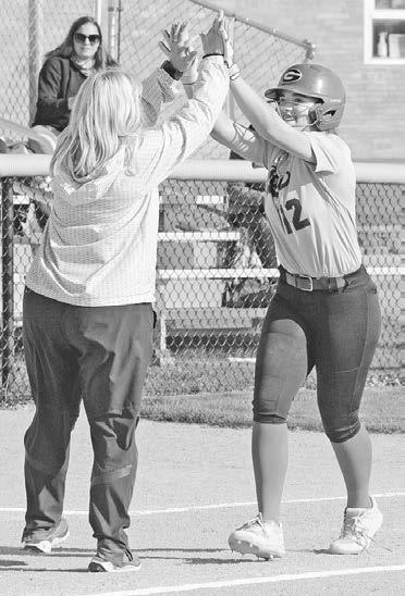 Glenbard East’s softball team raised its Upstate Eight Conference record to 7-3 with last week’s 16-0 home win over East Aurora. The Rams scored 12 runs in the bottom of the first inning of the April 25 contest, which wound up lasting four innings. Freshman Ally Amrhein of Glenbard East launched a two-run home run during the first-inning onslaught. Amrhein (No. 12) is pictured as she rounds third base and approaches Glenbard East coach Dawn Chantos after that homer. Junior Melissa Saldana (No. 7) went 2-for-2 and drove in three runs for the Rams during last week’s win over the Tomcats. Freshman Lilly Carver went 1-for-2 with two runs batted in for Glenbard East. Amrhein went 1-for-1 with three RBIs. Senior Raya Schwebl went 1-for-1 with two RBIs. Junior Marley Szeluga and freshman Althea Fitzgerald shared the Rams’ pitching duties in the shutout victory over East Aurora. Szeluga struck out two batters in one inning. Fitzgerald recorded four strikeouts in three innings. Glenbard East played a pair of games at Saturday’s tournament at Rolling Meadows High School. The Rams opened the event with a 7-3 win over Glenbrook South. Glenbard East lost its second game of the day, dropping a 4-2 decision to Palatine. The Rams’ overall season record stood at 12-6 at the end of the tournament in Rolling Meadows. Saldana went 3-for-3 and drove in two runs in Saturday’s win over Glenbrook South. Freshman Claire Bolda pitched a complete game for the Rams in the victory. Bolda allowed two earned runs, six hits and four walks in seven innings. She struck out four Glenbrook South batters. Glenbard East’s schedule this week includes conference games against Streamwood, South Elgin and Glenbard South.