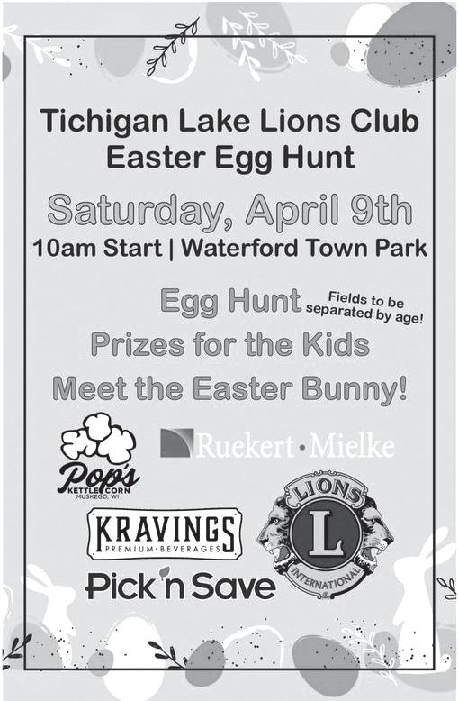 $10 - $15 per hour Full time benefits Employment application online at www.homesteadlearningcenter.com under the “careers” tab 434933 Hours 9-5 Mon.-Fri., 9-12 Sat. Makers of Quality Eyewear for Over 60 Years. Senior Citizen Discount Corner of Hwy. 36 & Main St., Waterford, WI 262-534-6090 www.flueggeoptical.com ALL LENSES MADE HERE IF YOU WANT A “BIG CITY” LOOK... ...YOU NEED TO STOP IN LITTLE ‘OL WATERFORD 434815w Tichigan Lake Lions Club Easter Egg Hunt 10am Start | Waterford Town Park Saturday, April 1 Egg Hunt Prizes for the Kids Meet the Easter Bunny! Fields to be separated by age! EVERYBITE ST. THOMAS AQUINAS SCHOOL HALL • WATERFORD 434932 Friday, March 31 Beer Battered or Baked Fish with choice of Baked Potato or French Fries Dine-In or Drive-Thru 4:00 to 7:00 p.m. ADULTS $13.00 CHILDREN $11.00 DESSERT AVAILABLE