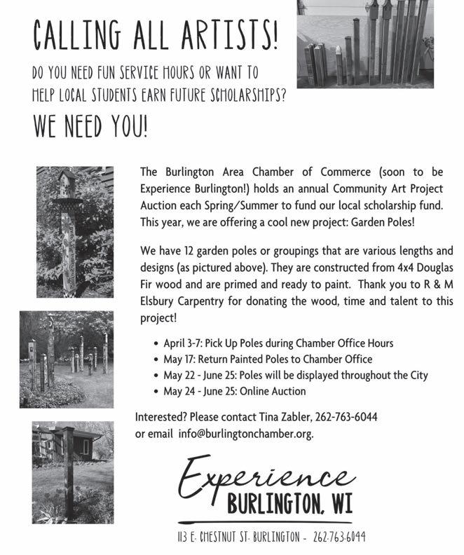 HI-LITER • MARCH 29-APRIL 4, 2023 • 6 400 N. Dodge Street • Burlington, WI 53105 262.767.1900 www.burlingtonwi.hamptoninn.com we love having you here.® Clean and fresh Hampton bed TM FREE hot breakfast with fresh waffles Refreshing swimming pool 100% satisfaction guarantee 47801 327590 435245 FURNACE TUNE-UP SPECIAL $9500* *EXPIRES 4/30/2023 WE SERVICE ALL MAKES AND MODELS!! 201 S. Pine Street Burlington, WI 262.763.2653 Stop in and see us! 24 HOUR EMERGENCY SERVICE ThielmannGroup.com q FREE QUOTES ON NEW EQUIPMENT q NO TRIP CHARGES q MAINTENANCE CONTRACTS q 0% FINANCING AVAILABLE* *To approved credit. $50 OFF Duct Cleaning RIZZO & DIERSEN, S.C. ATTORNEYS AT LAW Stephen Clubb Elder Law • Estate Planning 549 Milwaukee Ave., Burlington, WI 53105 (262) 763-0883 411606 435244 Open for tours: Mon.-Fri. 8:30 a.m.-5:30 p.m. Sat. 9 a.m.-3 p.m. Sun. 11 a.m.-3 p.m. Impressive Amenities for your Comfort Open daily for tours! 232 Bridge Street, Burlington, Wis. (262) 763-5959 Experience The Boardwalk Lifestyle ... Comfortable Surroundings, Close to Everything Love Where You Live! • Indoor Parking Available • Heat / Hot Water Included • Library • Complete Appliance Package w/ Washer & Dryer • Fitness Center • Professionally Managed w/ 24 Hr. Emergency Service Call (262) 763-5959 for information today or visit us at www.styza.com 435246 BURLINGTON AREA CHAMBER OF COMMERCE Check Out Our CALENDAR OF EVENTS and CHAMBER ANNOUNCEMENTS at www.BurlingtonChamber.org 408183 Experience x burlington, wi april events April 2 Chocolate Sale! Follow us for up-to-date community events and happenings! April 26 Noon - 7 pm + april 27 9 am - 5 pm kiwanis pancake breakfast flapjack 5k 5k sign up