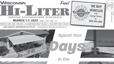 SERVING SOUTHEASTERN WISCONSIN APRIL 19-25, 2023 VOL. 72 • NO. 18 DISPLAY ADS (262) 763-2575 CLASSIFIEDS (262) 728-3411 DELIVERY (262) 728-3411 209 N. DODGE ST., BURLINGTON, WI 53105-1261 PUBLISHED BY SOUTHERN LAKES NEWSPAPERS, LLC Free! PRSRT STD U.S. POSTAGE PAID #335 DELAVAN, WI **ecrwss R esidential Customer SPRING SAVINGS* *Prices do not include tax, title, license and service fee. Dealership is not responsible for printing errors. Please see dealership for details. Sale ends 4/25/2023. Nick Kramer Jeff Mucks Patrick Lynch Bob Christensen Isaac Thiel Geoff Eckhardt Dan Dace Graham Robson Bob LaBadie Christian Rupp Nick Uhen Jim Olsson Josh Luchini Alfredo Morales Evan Richter Ben Howell Chris Kahlmorgan Joe Zubarik Craig Roffers Pedro Perez Dan Dotzler Pete Manos Donna Janz Thomas Gier OVER 200 PRE-OWNED VEHICLES! 2019 DODGE CHARGER SXT $26,490 P15208A 2020 FORD MUSTANG ECOBOOST PREMIUM $25,490 P15255 2019 RAM 1500 $35,990 P15242 2018 CHEVY MALIBU LT $20,990 P15265 2019 GMC CANYON DENALI $32,990 220575A 2019 CHEVY BLAZER RS $36,990 P15201 2016 DODGE GRAND CARAVAN SXT PLUS $21,990 ONLY 43,000 MILES P15295 2021 RAM REBEL $44,990 P15240 2016 HONDA PILOT TOURING $23,990 K220513B 2020 BUICK ENCORE GX ESSENCE $28,990 P15214 2012 GMC SIERRA 3500 SLT $32,990 220338C DIESEL 2022 CHEVY SILVERADO RST $46,990 DIESEL P15064 2019 CHEVY SILVERADO LT $33,990 230165A 2022 GMC SIERRA ELEVATION $47,490 DIESEL P15148 2021 VW ATLAS CROSS-SPORT $35,990 P15239 2021 GMC ACADIA DENALI $42,990 P14972 2022 GMC TERRAIN SLE $30,990 P15238 2018 CHEVY TRAVERSE LT $21,990 P15162A 2016 CHEVY SPARK LT $12,490 P15225 2021 FORD F-150 XLT $50,490 P15164 New to You Women's Consignment Boutique "Where Fashion Only Looks Expensive" 200 W. Main Street, Rochester Open Tuesday-Friday 10 a.m. to 5 p.m.; Saturday 10 a.m. to 3 p.m. (262) 534-7553 www.newtoyou-wi.com SHOP SUSTAINABLE SHOP SECONDHAND Celebrate Earth Day April 22 With Us!