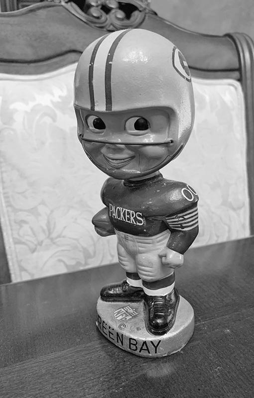 top: For many, the antiques open class at the Walworth County Fair gives them a chance to share memories and unique family heirlooms acquired over the years. This year, three entrants offered up their items for a brief history. above: Made during World War II from oilcloth due to shortages, this stuffed animal was a favorite of Jackie Walbrandt. at right: Breck Ward enjoys shopping for collectibles and antiques, including this Green Bay Packer bobblehead he entered at the fair this year. far right: This fan submitted by Bonnie Deutsch belonged to her grandmother.