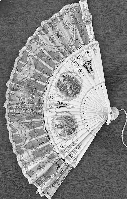 portraits of three different women and one of a cherub adorning the front side of the fan.