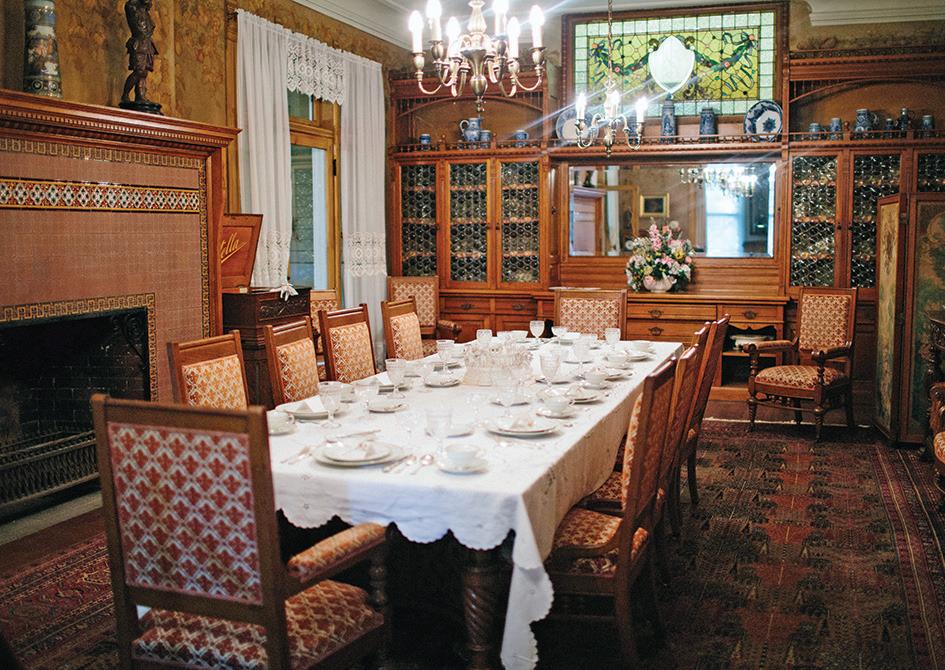The first floor contained the public rooms. A dining room which could seat up to 40 at a time was usually full at meal times as the Seipp family enjoyed sharing their summer home with family and friends. Meals were served in formal style and visitors dressed for dinner. Interesting since the home was built without a kitchen. The kitchen was a separate building where the staff cooked the elaborate meals served in the main home.