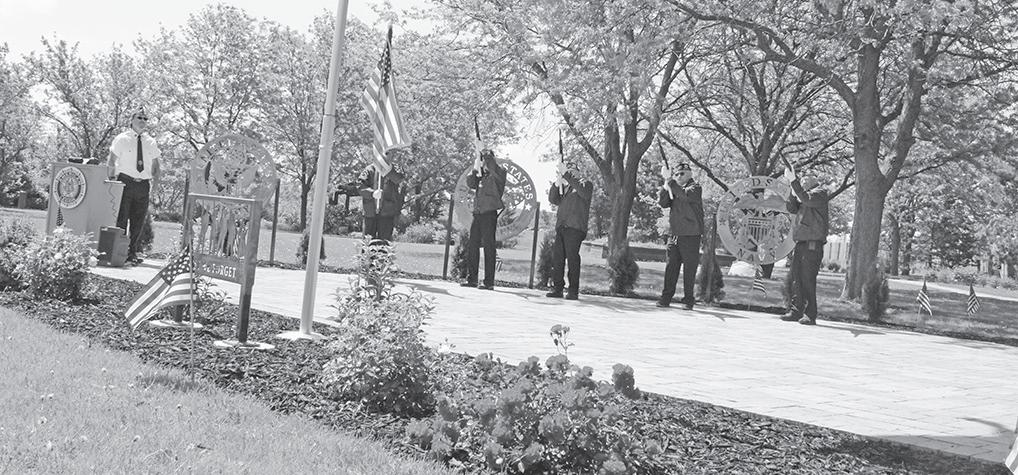 top: Congdon Gardens in Delavan is the home for the city’s new veterans memorial, which was dedicated May 20. Top: The sign “Lest We Forget” sits in front of the memorial area. at left: An honor guard fires a 21-gun salute at the dedication.