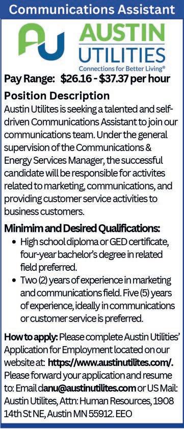 Deadline for ALL DISPLAY ADS is 5 pm ursday prior to the following Tuesday’s publication of the MOWER COUNTY SHOPPER