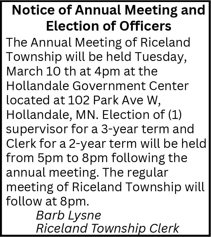 Meetings and election will be held at the Albert Lea Townhall at 1508 South Broadway, Albert Lea, MN.