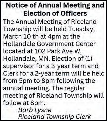 Notice is hereby given to the residents of London Township, County of Freeborn, tate of Minnesota, that the Annual Meeting will be held Tuesday, March 10th at 7:00 pm with regular monthly meeting to follow. nclement weather date will be Thursday, March 12th at 7:00 pm with regular monthly meeting to follow The annual meeting will be to conduct all necessary business prescribed by the law The meeting will be held at the London Township Hall in London, Minnesota Dawn Broitzman London Township Clerk