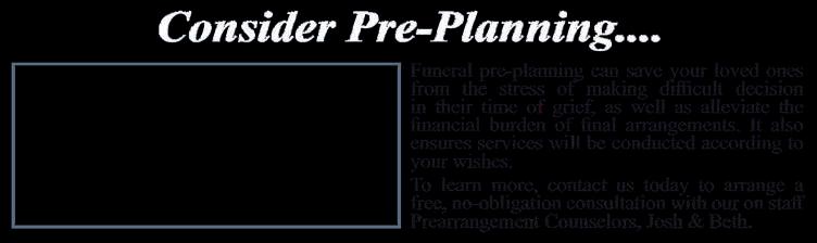 Funeral pre-planning can save your loved ones from the stress of making difficult decisions in their time of grief, as well as alleviate the financial burden of final arrangments. It also ensures services will be conducted according to your wishes. To learn more contact us today to arrange a free, no-obligation consultation with our on staff Pre-need Counselor, Beth.