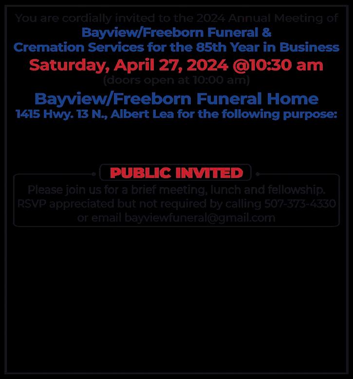 Starting Wage Range: $16.00 –$22.00 per hour/DOQ, plus benefits. Part-time: approximately 30 hours per week. This is a non-union position. Applications and full job description may be obtained at City Hall, 402 Park Ave, Freeborn, MondayThursday from 7 a.m. to 2 p.m., by calling (507) 863-2014 or by email to ctyfrb@bevcomm.net.