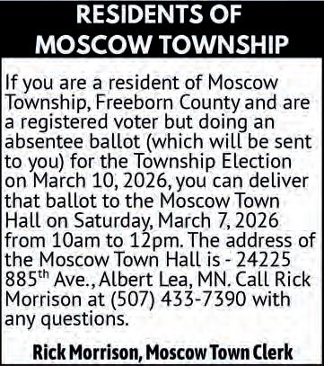 Freeborn County is looking to hire a full-time (40 hrs./week) Maintenance worker in the Maintenance Department. The Maintenance workers are responsible for maintaining a clean, orderly and safe environment in County buildings, equipment and grounds. For more information, and to complete an application, please visit the Freeborn County website at www.co.freeborn.mn.us. Completed applications, along with a cover letter and resume are due by 12:00 PM on Friday, January 30 th , 2026