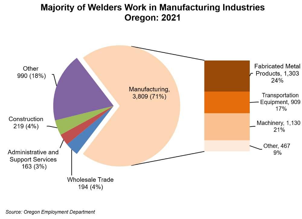 Oregon’s welders and solderers work in many types of industries, but the majority of workers (71%) were concentrated in manufacturing industries in 2021.Three manufacturing sub-