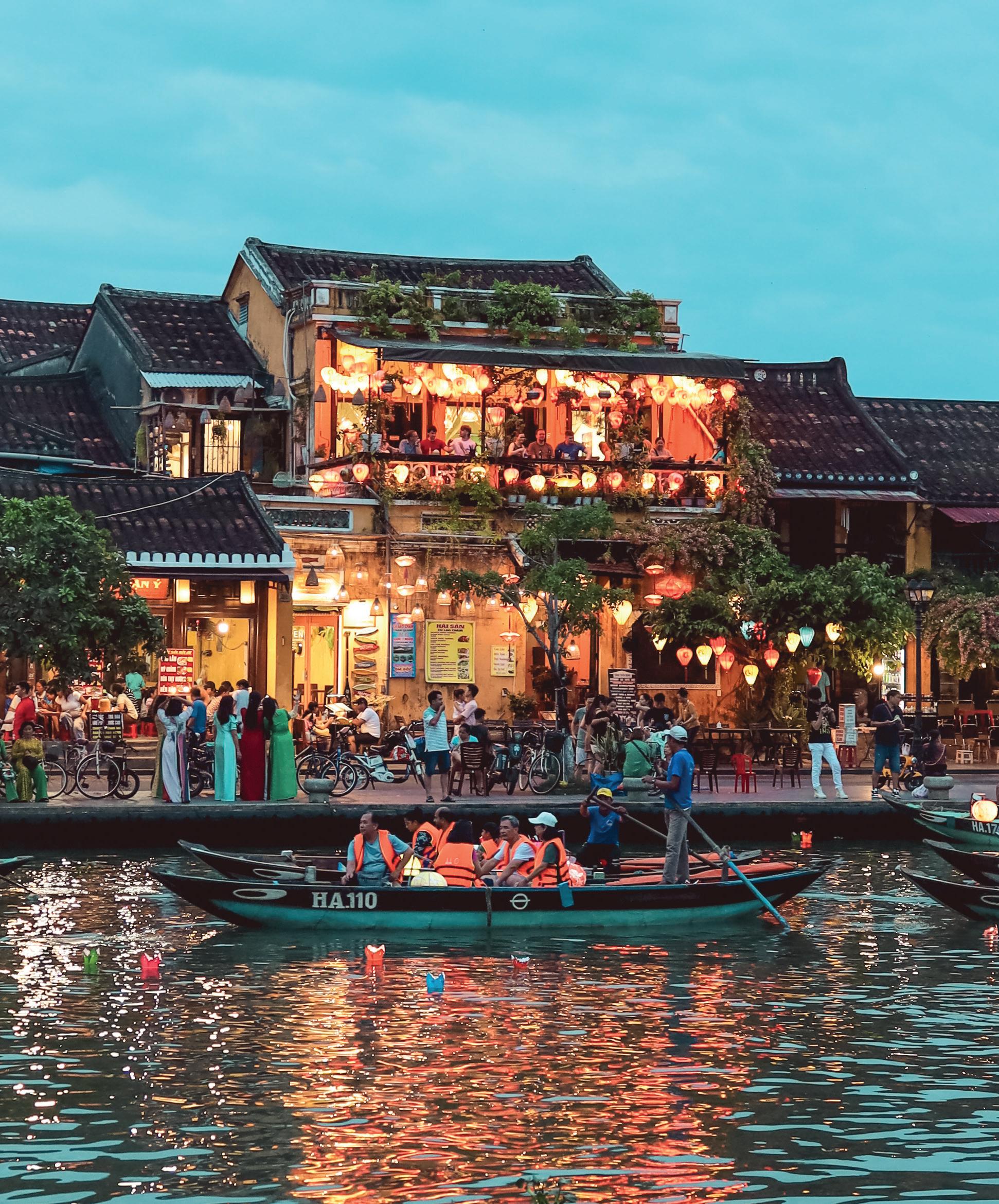 Several streets wind their way to the river, lined with tiled houses with traditional motifs carved into their wooden parts. It’s mesmerising and sometimes overwhelming as you’re transported into a new world. After wandering the streets, likely having been measured up and ca einated (the old town is famous for its tailors and co ee roasters), find a riverside restaurant and watch the evening spectacle unfold; hundreds of boats carrying colourful lanterns float along the river, providing a kaleidoscope of colours that reflect along the rippling waters.