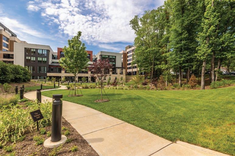 Our commitment to environmental stewardship was recently recognized by the City of Charlotte with the 2024 Corporate Friend of the Urban Forest Award. This honor highlighted the transformation of The Wallace Dell, an enhanced, expansive green space featuring natural areas and native North Carolina plants, walking paths and a gentle, babbling stream. During construction of The Sharon’s expanded facilities, care was taken to save as many existing trees as possible. Idyllic views of the serene Dell space can be enjoyed from all levels of the Weisiger Health Center, as well as from inside dining areas and terraces.