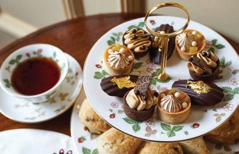 followed by homemade scones and miniature cakes, tartlets and chocolate-covered strawberries.