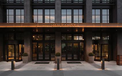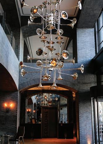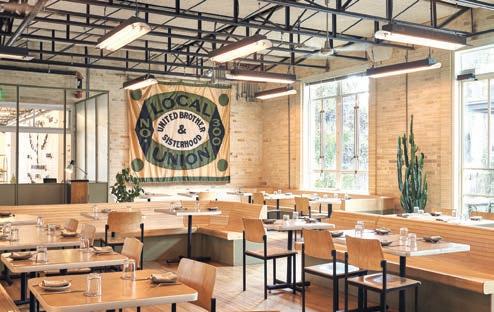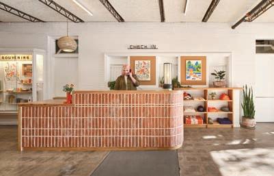 The lobby and restaurant are housed in a renovated 1948 union meeting hall. The midcentury institutional flair is offset by the