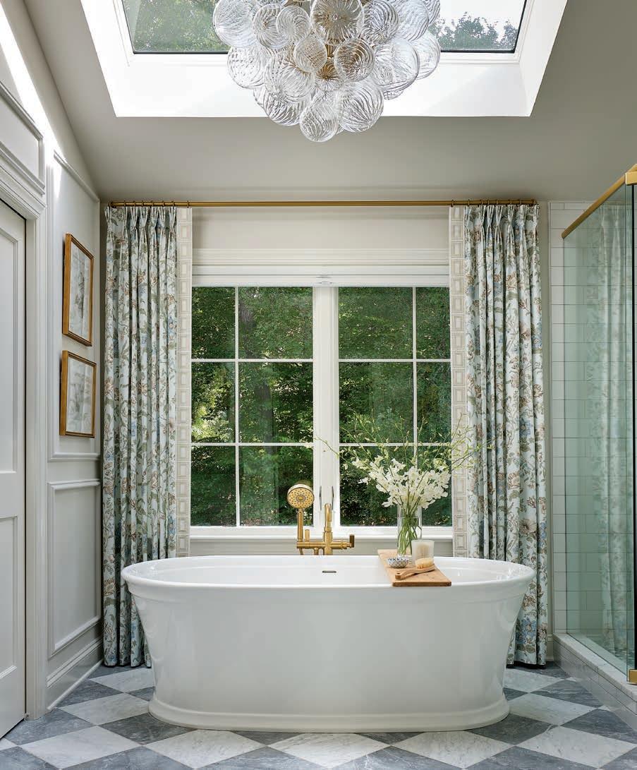 “You walk into the room and you see the tub framed with beautiful natural light, and it feels really serene,” Cappio says. Classic elements like Italian marble, brass fixtures and wainscoting create a timeless feel.