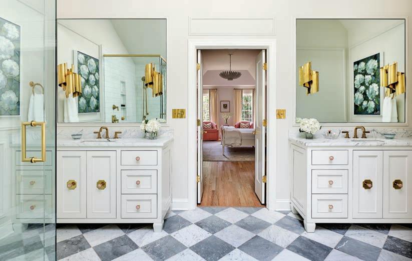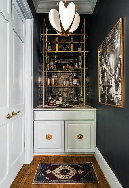 The renovation, which included the kitchen, breakfast nook, living room, laundry room, a child’s bedroom and hisand-hers wet bars, centered on the floral harlequin wallpaper in the powder room.