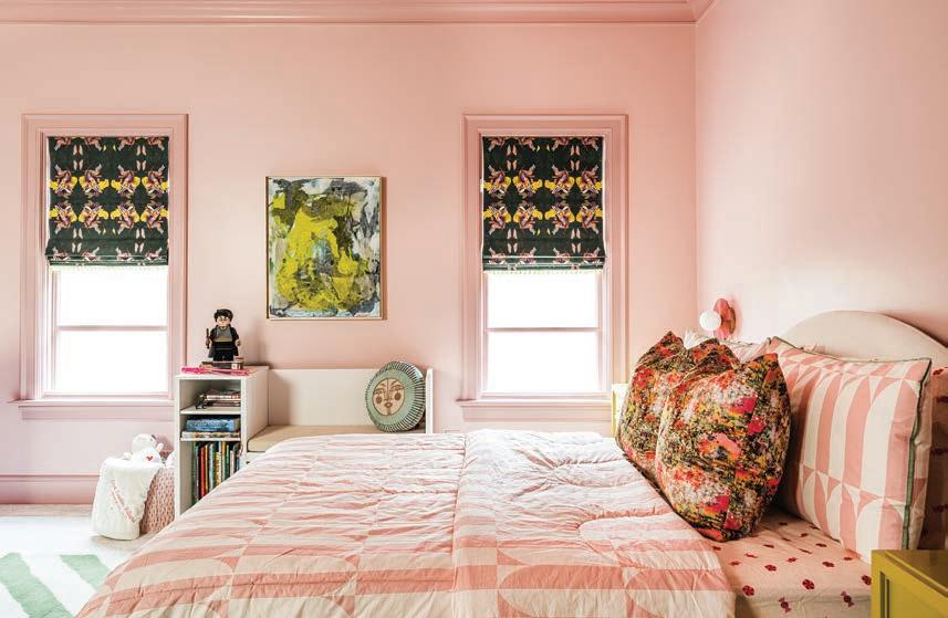 For their daughter’s bedroom, DeLapp “dipped the whole room in pink” by painting the walls, ceiling and trim in a bubblegum hue. She added custom window treatments, a striped area rug and pops of chartreuse throughout the space to pull in the color from the Jack-and-Jill bathroom.