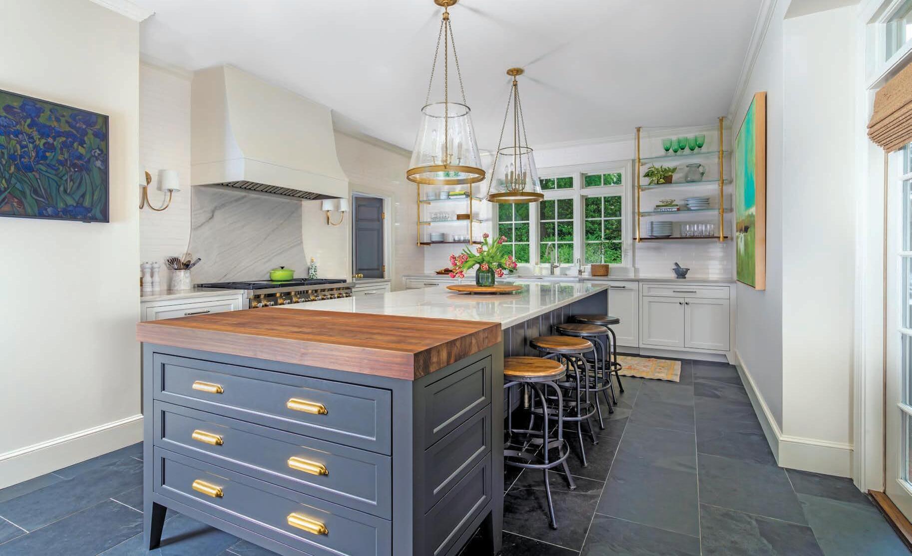 “He went to Chapel Hill, so I went with Carolina blue on his cabinets,” she says. The gold-toned shelving and fixtures complement the gold splatter in the glass-tile backsplash, and the chandelier, suspended from a gold-link chain, has leaf-inspired shapes that feel elegant but not overly formal.