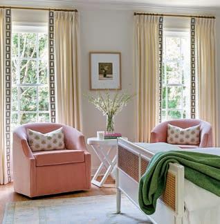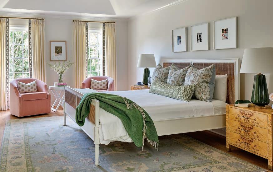 In the adjacent bedroom, a hand-knotted Oushak rug from Dallas artist Lindsey Meyer was the jumping-off point for the design. Working with a palette of blush pink, dusty blue and grass green, Cappio kept the walls quiet with a warm white paint. She pulled in color through the pillows, draperies and a pair of pink velvet swivel chairs. New hardwood flooring, burlwood bedside tables and a caned headboard add warmth and texture.