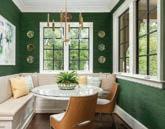 DeLapp brightened up the breakfast nook with patterned wallpaper from Milton & King and painted the dark stained trim and ceiling in a high-gloss pink with magenta undertones. She modernized the homeowners’ circular dining table with new upholstered chairs.