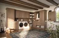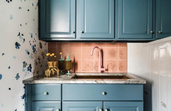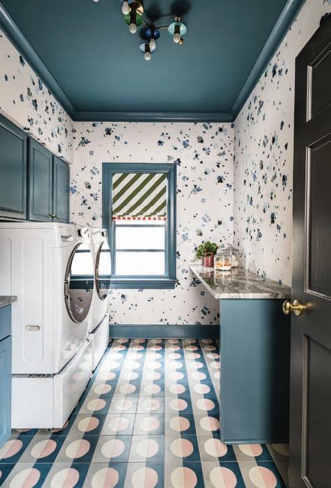 In the laundry room, DeLapp dressed the walls in a Schumacher pattern with painterly blue splotches and installed pink-and-blue concrete floor tile. She painted the existing cabinets, trim and ceiling a peacock blue and added gray marble countertops and a custom folding table.