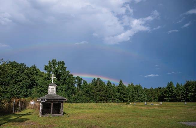 Crossing the Bennettsville border into Blenheim, a brief rainshower begins and ends. Eva giddily calls out to her mom as she spots a double rainbow. We make a U-turn to get a closer look, and, by chance, our first opportunity to safely pull off of the road is in a church parking lot. We look up to the skies as Eva twirls under the rainbow.