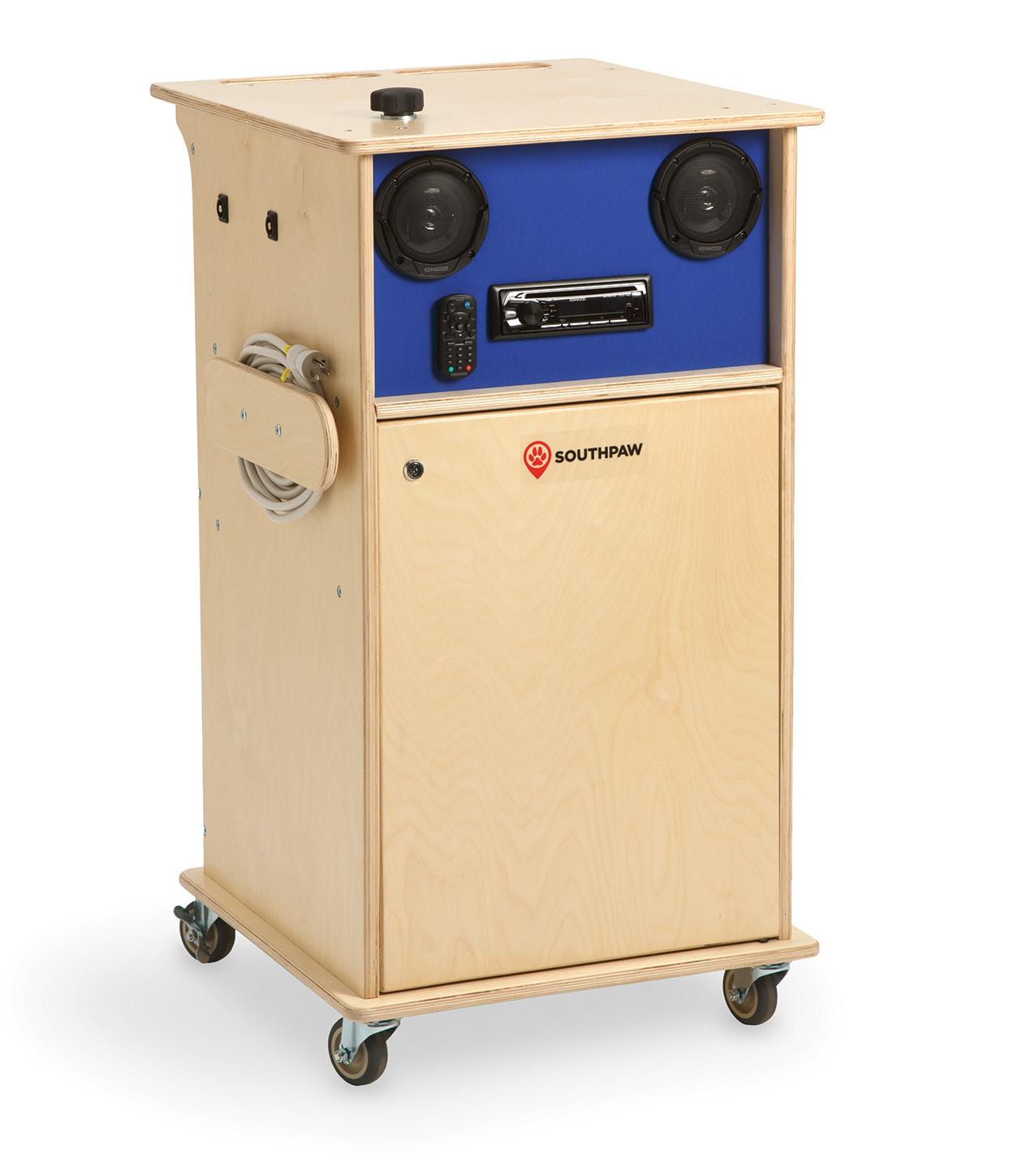 The Stereo Rover stereo is housed in a sturdy birch cabinet that includes a storage unit with one shelf, a 6-plug power strip, and wheels that allow it to be moved anywhere in the room. Each Stereo Rover includes an anchor on the top of the unit that can be used to attach an LED Solar Projector or Star Gazer (not included).